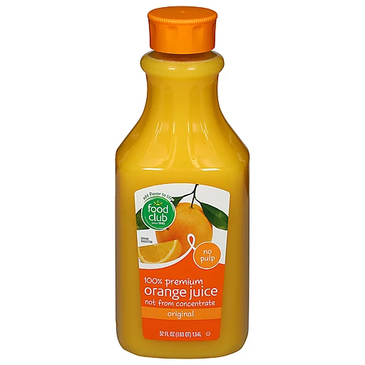 Food Club Juice, Orange, 100% Premium, No Pulp, Original, Orange 52 fl oz