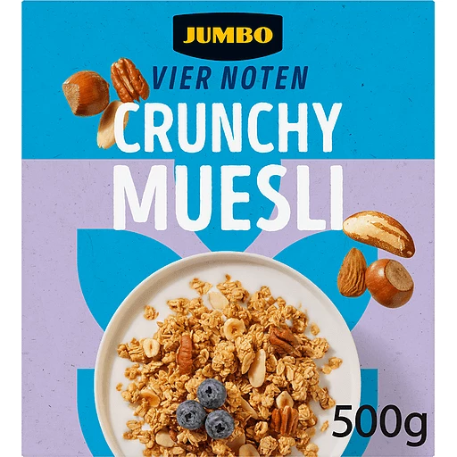 JUMBO CRUNCHY MUESLI VIER NOTEN is a wholesome and crunchy muesli blend crafted from high-quality oats, nuts, and fruits. It offers a perfect balance of taste and nutrition, providing a rich source of fibre and energy to start your day right. Enjoy it with milk, yoghurt, or as a healthy snack any time of the day.