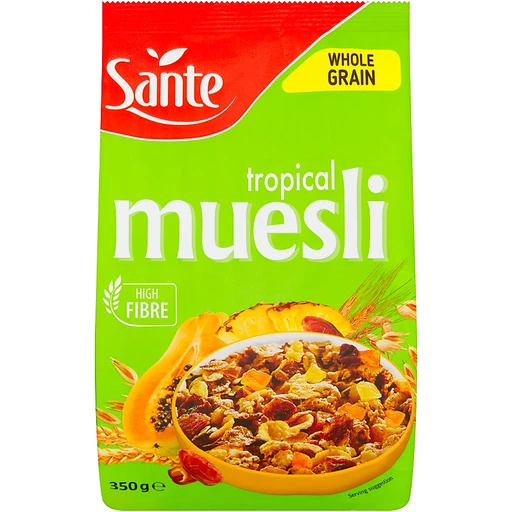 SANTE MUESLI TROPICAL FRUITS is a wholesome and crunchy muesli blend crafted from high-quality oats, nuts, and fruits. It offers a perfect balance of taste and nutrition, providing a rich source of fibre and energy to start your day right. Enjoy it with milk, yoghurt, or as a healthy snack any time of the day.